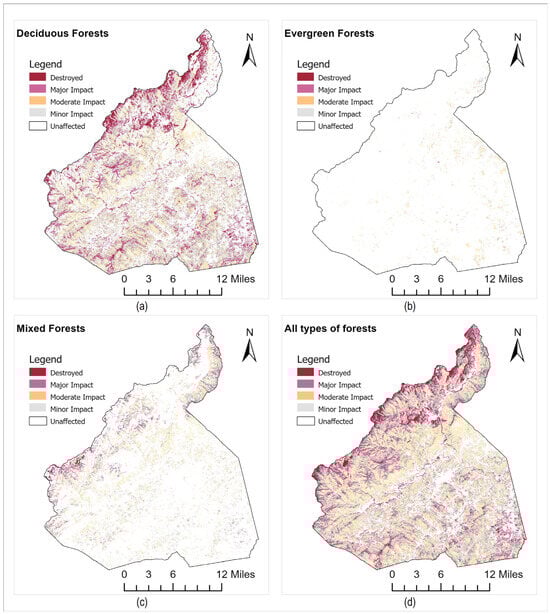 Damage Severity Map: (a) for deciduous forest, (b) for evergreen forest, (c) for mixed forest, and (d) for all forest types.