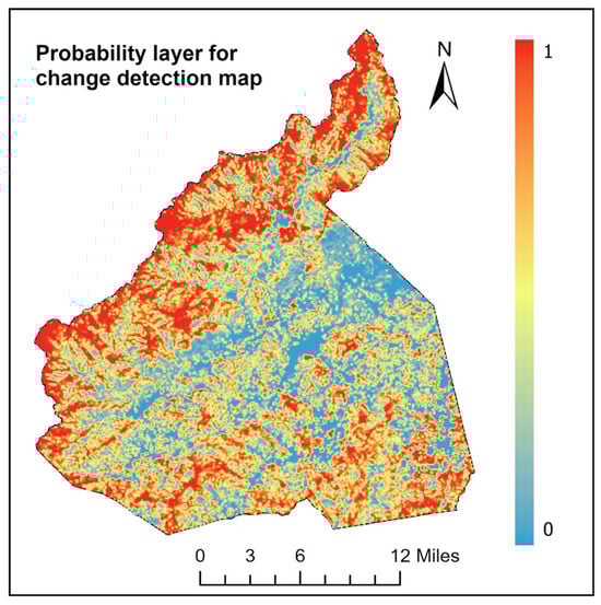 Figure 12 shows the map of forest damage severity for deciduous, evergreen, and mixed forest types using the M8 model. For evergreen forests, most impacts fall into the minor to moderate categories. Figure 13 presents the probability map corresponding to the detected forest changes. In this map, areas highlighted in red represent high probability values (closer to 1), indicating a strong likelihood of change, while areas in blue correspond to low probability values (closer to 0), suggesting little to no change. The spatial distribution of these probabilities aligns well with the change detection results shown in Figure 12d, thereby reinforcing the reliability of the classification outputs and offering additional insight into the confidence of detected changes. This probability layer can support more informed decision-making by allowing users to prioritize areas for field validation, further analysis, or targeted management actions based on confidence levels.