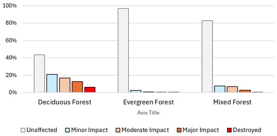 Figure 14 shows the damage severity comparison between different types of forest. Deciduous forest appears to be more impacted, especially in the minor impact and moderate impact categories, suggesting it may be more vulnerable to damage than the other types. Evergreen forests show minimal destruction and major impact, which could be due to the resilience of evergreen trees or their ability to withstand harsher conditions. This capability may be attributed to the structural characteristics and nutrition cycles of evergreen trees. Mixed forests show moderate values across the impact categories, but like the evergreen forest, they have a large unaffected portion, indicating some level of resilience across both deciduous and evergreen forest types. Both evergreen forest and mixed forest have a large portion that remains unaffected by any impact, with the evergreen forest being the most resilient (96.95%). Deciduous forest also has a significant unaffected portion (43.60%), but this is still less than the other two forest types. The evergreen forest shows a significantly high value for the unaffected category (96.95%), indicating that most of this forest type remains untouched. However, the destroyed and major impact categories have very low values, indicating that this forest type has experienced very little destruction or major damage. The moderate impact and minor impact categories have slightly higher values, but they are still much lower than the unaffected category. For the mixed forest, the highest values appear in the unaffected category (82.79%), like the evergreen forest. The minor impact and moderate impact categories follow with values of 7.49% and 6.80%, respectively. The destroyed and major impact categories have relatively small values, showing that mixed forests experience less severe damage than other forest types.