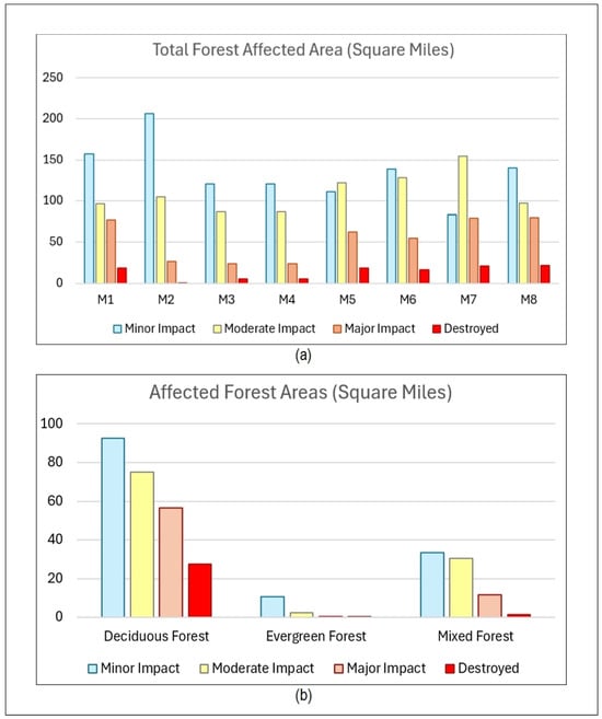 Figure 15b illustrates the affected area estimates for different types of forests. In the deciduous forest, the largest affected areas are in the minor impact category, followed by moderate impact, major impact, and finally the destroyed category, which has the smallest affected area. The evergreen forest has minimally affected areas in all categories, with the largest being in the minor impact category. The destroyed category has a minimal area (0.05 square miles), indicating that the evergreen forest is the least impacted in terms of destruction compared to the other impact categories. In the mixed forest, like the deciduous forest, the largest area affected is in the minor impact category, followed by moderate impact, major impact, and destroyed, with the smallest affected area. Deciduous and mixed forests have larger affected areas across all impact categories, particularly in the minor and moderate impact categories, indicating a wider range of disturbances. The low values in all categories indicate that the evergreen forest is likely less impacted overall compared to deciduous and mixed forests, possibly due to its specific ecological characteristics, such as resilience to disturbances.