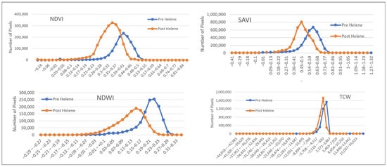 To visually compare the sensitivity of different indices in the proposed mixture models for detecting forest damage, pre- and post-Helene histograms of NDVI, NDWI, SAVI, and TCW are presented in Figure 16. As models M1, M7, and M8 are found to be better-performing models in terms of precision, F1 score, OA, and JS, we investigate their constituent spectral indices NDVI, NDWI, and SAVI for statistical comparison. Consistent with the work in [], we observed from the results of the multiple spectral signatures that using more than one spectral index can be quite advantageous for forest disturbance detection. The authors in [] examined the utility of multiple spectral indices and corresponding correlations to detect improved forest disturbances in an ensemble setting. These results further align with the findings in []. Spectral indices based on three conceptually independent categories corresponding to soil, vegetation, and moisture characteristics improved the accuracy of forest change detection []. To enhance the study, the histograms employ lines rather than traditional bar charts to depict the distribution of ∆SIs. The amplitude of the change was directly correlated with the sensitivity of these indices to hurricane impacts. The authors in [] utilized NDVI, TCG, and TCB to evaluate change detection using remote sensing images for land cover applications for improved performance. The larger shift in ∆NDVI (0.11) as compared to ∆SAVI (0.09), ∆TCG (0.05), and ∆TCW (0.08) contributed to improved accuracy (Table 7). This result is in agreement with the work presented in []. The NDVI–albedo combination was found to be better than the TCG–TCB-based combinations []. This result also aligns with the outcome presented in [] to assess the desertification risk using change vector analysis.