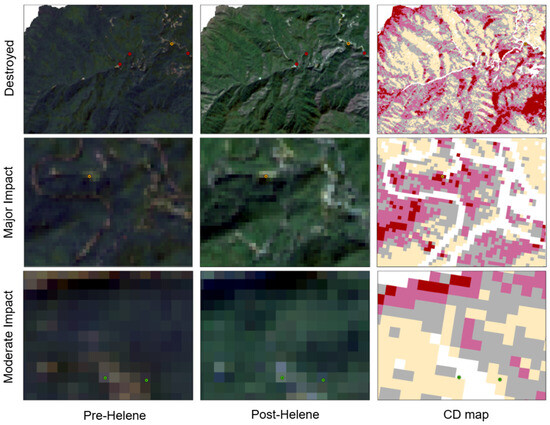 Overlay of GIS datapoints on CD map; the red (in the first row), orange (in the second row), and green (in the third row) GIS datapoints indicate destroyed, major impact, and moderate impact pixels respectively.
