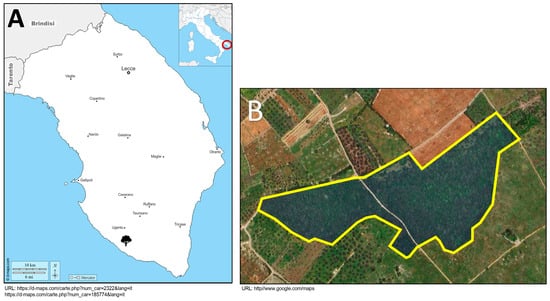 (A) The figure presents the geographical map of Italy, with a focus on the Salento region. The red triangle indicates the geographic location of the sampled area. (B) The figure depicts the aerial view of “Bosco dei Romani”, with the area highlighted in blue.
