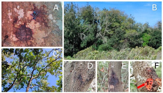 The figure shows the symptoms and conditions observed: (A) brown exudate and patches observed on the bark; (B,C) crown dieback and defoliation; (D,E) dark patches on the bark, given by the necrotic activity of bacteria; (F) red arrow indicates insect galleries under the bark.