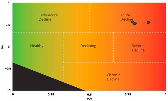 Quantification and classification of decline symptoms on kermes oak: the trees have a positive Decline Acuteness Index (DAI) value, between 0.5 and 1, indicating acute decline, while the Phenotypic Decline Index (PDI) closer to 1 means high severity of symptoms. The blue circles represent samples where AOD symptoms were observed and confirmed. The black area at the bottom left indicates the undefined decline indexes.
