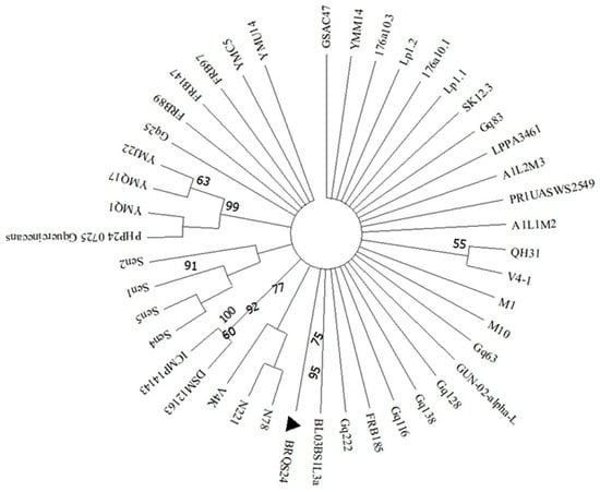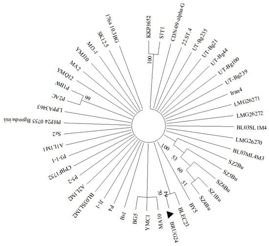 Phylogenetic tree based on 16S gene sequencing of B. goodwinii isolate BRUG24 (▲). The strains KKP 3652 and S1T1 of S. fonticola represent the outlier and are genetically the farthest strain; all other strains reported in the phylogenetic tree refer to B. goodwinii. For the phylogenetic tree, maximum likelihood based on the Tamura–Nei model was used.