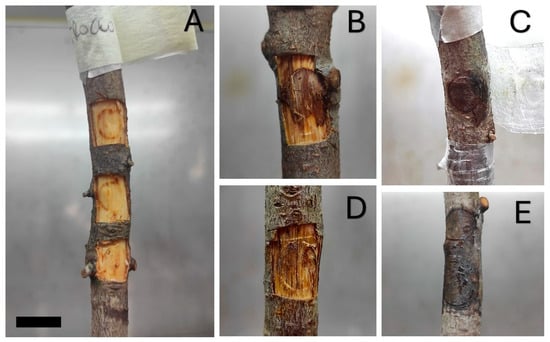 The picture shows the state of the twigs one month after inoculation. (A) The branch on which the mock inoculation was carried out showed no signs of wood necrosis; (B) the branch inoculated with B. goodwinii showed extensive wood necrosis, and (C) the bark showed a moist brown patch; (D) the branch inoculated with G. quercinecans also showed necrosis of the wood extending beyond the inoculum point; (E) also in this case, the outer bark showed an extensive brown, moist patch with a brownish exudate. As a reference, the bar in the bottom-left-hand corner equals 1 cm.