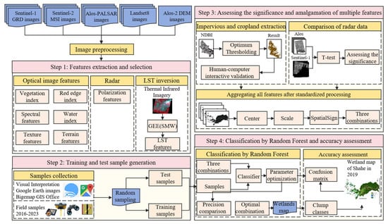 - Wang, M.; Mao, D.; Wang, Y.; Xiao, X.; Xiang, H.; Feng, K.; Luo, L.; Jia, M.; Song, K.; Wang, Z. Wetland Mapping in East Asia by Two-Stage Object-Based Random Forest and Hierarchical Decision Tree Algorithms on Sentinel-1/2 Images. Remote Sens. Environ. 2023, 297, 113793. [Google Scholar] [CrossRef]