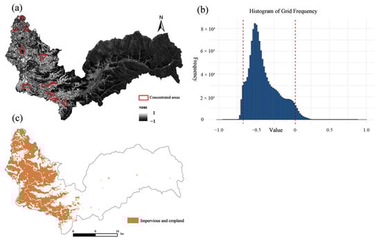 Impervious and cropland extraction: (a) Sample area selection; (b) Histogram of Grid Frequency; (c) Map of urban areas.