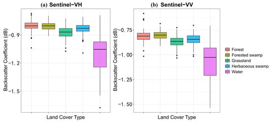 Polarimetric backscattering coefficient variations across land cover types from Sentinel-1 data: (a) Sentinel-1 VH polarization backscattering coefficients (dB); (b) Sentinel-1 VV polarization backscattering coefficients (dB). Boxplots show median (central line), interquartile range (IQR, box edges). Data derived from 120 samples per category (n = 120).