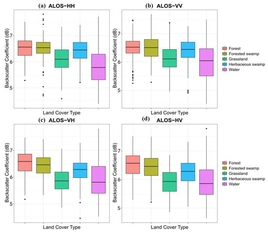 Polarimetric backscattering coefficient differences of ALOS-2/PALSAR across land cover types: (a) HH polarization; (b) VV polarization; (c) VH polarization (distinct separation: vegetated vs. non-vegetated surfaces); (d) HV polarization (cross-polarized signatures).