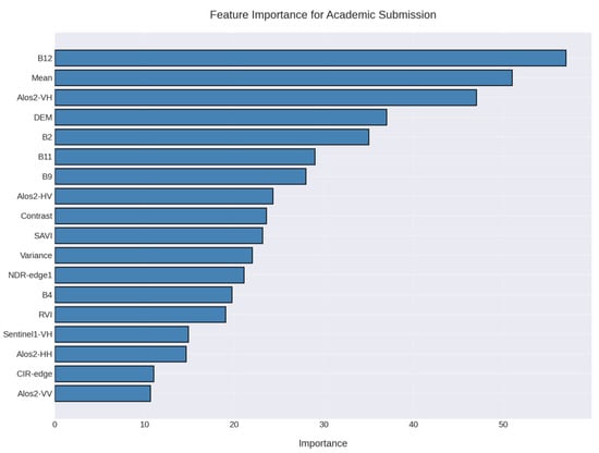 Utilizing a RF model, this study quantified feature contributions to forest swamp information extraction via multi-source remote sensing data (Figure 6). Sentinel-2 Band 12 yielded the highest score [54], attributable to its NIR sensitivity for delineating saturated hydrological environments like forest swamps. Band 12 emerged as a critical discriminator for saturated hydrological environments. The Mean texture feature (score: 51) highlighted textural homogeneity’s role in characterizing forest swamp surface patterns. ALOS-2′s VH polarization (score: 47) underscored the polarimetric radar’s efficacy in capturing canopy structural and dielectric variations [37]. DEM and Sentinel-2 Band 2 emphasized terrain elevation and blue band reflectance’s roles in topographic and hydrological characterization [35]. These findings validate multi-sensor fusion’s capacity to enhance feature discriminability in wetland mapping.