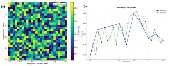 (a) Optimal weights for DEM, Mean texture, and Band 12 via grid search. (b) Stratified hierarchical optimization of optimal weights for VH polarization backscattering coefficients.