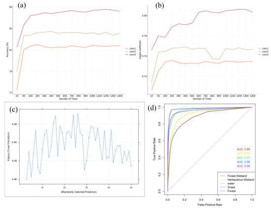 Our findings suggest that the accuracy and Kappa coefficient of extracting forest swamp coverage information using RF displayed an initial increasing trend during the 10–100 classification tree stage, followed by a stable fluctuating pattern. As the number of classification trees increased, the extraction time for wetland information in the protected area correspondingly increased. The optimal combination of hyperparameters, determined through techniques such as 10-fold cross-validation and grid search, identified Combination 3 (ntree = 1200, mtry = 28) as the best (Figure 8c). Among the three combinations, the optimal number of RF classification trees for extracting forest marsh information from the protected area varied. Combinations 1, 2, and 3 had optimal classification trees of 200, 400, and 1200, respectively. When comparing the optimal overall accuracy and Kappa coefficients, Combination 3 achieved the highest values (84.78%, 0.8062), whereas Combination 1 had the lowest values (81.50%, 0.7557) (Figure 8a,b). In the 10-fold cross-validation, the average AUC value for classifying forest marshes using the model reached 0.89 (Figure 8d), demonstrating excellent validation results [55]. The variations in the multi-category ROC curves were small and relatively concentrated, indirectly indicating the stability of the model’s performance and its resistance to sample set division.