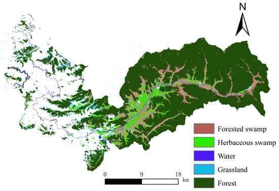 Wetlands are widely distributed across the eastern part of the research area with notable spatial heterogeneity, covering an estimated total area of 229.95 km2, of which 54.75% were forested wetland, followed by herbaceous swamp (37.66%) and water (7.59%) (Table 6). Elevational gradients drive distinct ecosystem distribution in SRB, characterized by a hierarchical progression from perennial water bodies in lowland depressions (supporting hydrophilic flora and fauna) to herbaceous wetlands on mid-elevation slopes (thriving on well-drained terrain with seasonal moisture) [54]. At higher elevations, forested swamps persist on stable groundwater-fed microtopography, sustaining arboreal vegetation, while arid montane zones host xerophytic forests adapted to limited inundation. Notably, these forested swamps act as critical ecohydrological buffers, reducing monsoon peak discharge by 18%–25% through hydraulic retention and groundwater recharge for adjacent ecosystems. This spatial patterning not only elucidates the ecohydrological mechanisms governing wetland distribution but also provides a foundation for prioritizing conservation efforts in temperate mountainous regions.