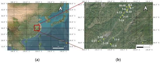 The study site is located in Jixi County, Xuancheng City, Anhui Province, China, and includes a total of 146 sample trees across 13 different plots, each of which is square-shaped with an area of 10 × 10 m2. The distribution of the study plots is shown in Figure 1. The dominant tree species in this region include Chinese fir (Cunninghamia lanceolata), Masson pine (Pinus massoniana), Huangshan pine (Pinus hwangshanensis) and Mongolian oak (Quercus mongolica). As illustrated in Figure 1b, the forest is densely distributed, and each study plot is labeled using the format Plot Number—Number of Sample Trees in the Plot. While species-level sampling was not differentiated in this study, the average height of all sampled trees was approximately 19.6 m. According to regional forestry data, the typical height ranges for these species are as follows: Chinese fir (18–22 m), Masson pine (17–21 m), Huangshan pine (20–23 m) and Mongolian oak (15–18 m).