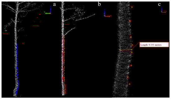 Figure 2. Trunk contour curvature labeling. ((a) Contour in the laser shot direction; (b) contour in the vertical direction of the laser shot; (c) relative length as a control. The blue and red points indicate the trunk outline projected from the X and Y directions, respectively).