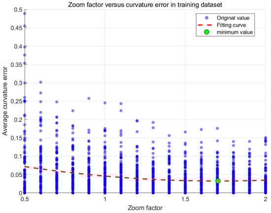 Figure 4. Single zoom factor versus curvature error. (Blue dots indicate the original values, red dashed lines indicate the fitted curves, and green dots indicate the minimum values of the fitted curves).
