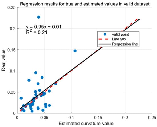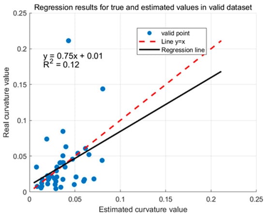 Figure 8. Predicted and true values of curvature for the validation set with two factors. (Blue dots indicate validation set data, black lines indicate regression lines. p = 0.0029, p < 0.05 indicates significant regression relationship).