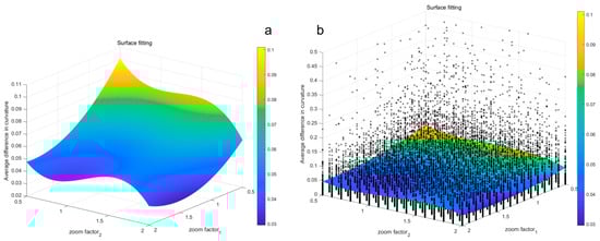 Figure 7. Simulated annealed fitted surface with dual zoom factor versus curvature error. ((a) Simulated annealing method surface fitting plot; (b) curvature error versus fitted surface).