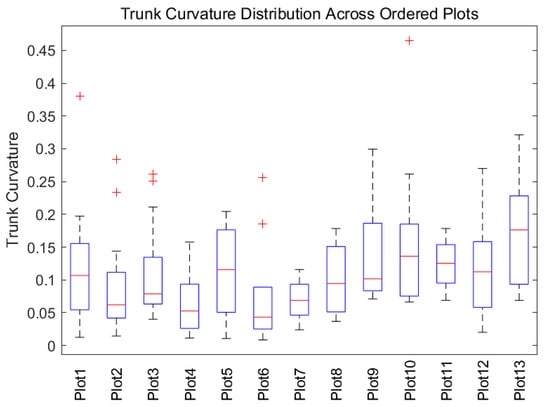 Figure 9. Boxplot showing the distribution of trunk curvature across the 13 sample plots (Plot1 to Plot13). “+” indicates outliers.