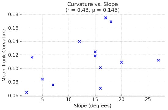 Table 3 shows the curvature of the trunks in each sample plot. In order to further evaluate the hypothesis that there is a correlation between terrain steepness and trunk curvature, a Pearson correlation analysis was performed between the average slope and mean trunk curvature across the 13 sample plots. The result demonstrated a moderate positive correlation (r = 0.43), thus indicating that plots with steeper slopes tend to have higher curvature values. However, the correlation was not statistically significant (p = 0.145), likely due to the limited number of plots. Despite the absence of statistical significance, this trend lends support to the hypothesis that terrain may exert an influence on the shaping of tree architecture. The investigation of this hypothesis is recommended, with the undertaking of such research being advised at the level of a larger sample size or higher-resolution slope measurements. The correlation is shown in Figure 10.