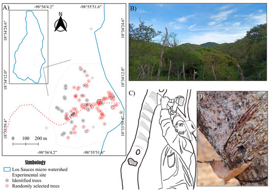 (A) Location of the 70 sampling units (copal trees) at the experimental site, within the Los Sauces micro-watershed study area, State of Morelos, Mexico. (B) Experimental site. (C) Extraction technique. (D) Resin tapping faces.