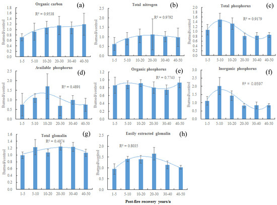 GRSP (TG and EEG) increased significantly after the fire, but did not change considerably with the fire recovery years. GRSP is a hydrophobic glycoprotein released in soil by AM fungi [42]. The occurrence of wildfires increases the surface soil temperature and regulates the soil microbial community structure to a certain extent [43,44,45]. In addition, pyrogenic organic matter may be produced during forest fires, including semi-charred biomass, charcoal, and black carbon [23]. These factors may be the reason for the increase in GRSP after the fire.