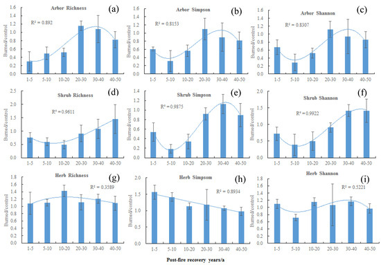 Effects of post-fire recovery years on plant diversity. (a) Arbor richness; (b) arbor Simpson index; (c): arbor Shannon–wiener index; (d) shrub richness; (e) shrub Simpson index; (f) shrub Shannon–Wiener index; (g) herb richness; (h) herb Simpson index; (i) herb Shannon–Wiener index. The cubic equation was used in the best-fitting of the temporal changes, and the best-fitting coefficient can be found in Table S4.