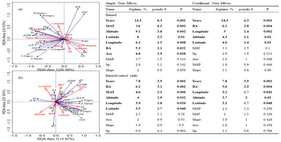 RDA ordination was also performed by using the relative changes in soil properties, plant diversity, and community structure (ratio between burnt sites and control sites) and mean values of geoclimatic data in burnt and control sites to identify the reason for forest recovery variations after the fire. The most significant factor for burnt/control ratio variation was the Years factor (7.8%, p = 0.002) in the simple term-effect analysis and the Years factors in the conditional term-effect analysis, respectively (p = 0.002). The recovery years factor was more closely related to arbor size, diversity, and SOC, and its action direction was opposite to MAP and altitude. The greater the longitude and the smaller the latitude, the more significant the TN, TG, and Po difference between the burnt sites and control sites (Figure 5b).