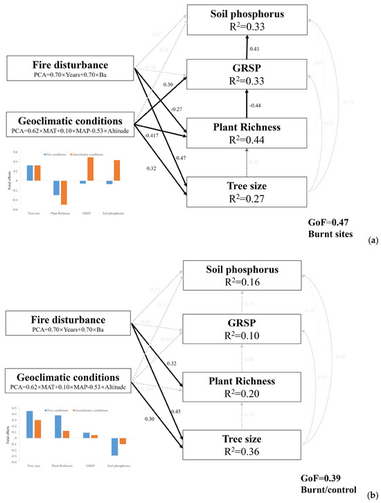 The PLS-PM was best represented here with a GoF 0.47 in burnt sites. In the model, the R² values for soil phosphorus, GRSP, plant species richness, and tree size were 0.33, 0.33, 0.44, and 0.27, respectively. According to the PLS-PM, fire conditions exerted significant direct effects on plant richness and tree size, and geoclimatic conditions exerted significant direct effects on soil GPSP, plant richness, and tree size. However, there was not a significant direct effect of fire conditions on GRSP content. Together, this suggested that fire conditions exerted indirect effects on GRSP mainly through direct effects on plant richness. There was not a significant direct effect of geoclimatic conditions on soil P content. This suggested that geoclimatic conditions exerted indirect effects on soil TP mainly through direct effects on GRSP (Figure 6a).