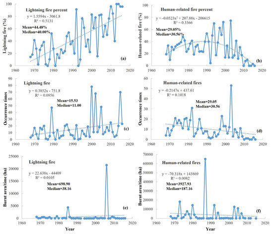 In the studied region, 1967–2016 forest fire statistics showed that the lightning-related fire burnt area averaged 698.9 ha; the human mistake-related fire burnt area averaged 3928 ha. The fire incidence for lightning-related fires was averaged at 15.5 times/year, and human mistake-related fires were averaged at 29.1 times/year. The lightning-related fire percentage linearly increased from <20% in the 1970s to >80% in the 2010s, and human mistake-related fires decreased by <10% in the 2010s (Figure 7).