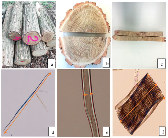 Images for (a) wood material; (b) disc; (c) strips from bark to bark; (d) fiber length (4× lens); (e) fiber width (10× lens); and (f) vessel dimensions (40× lens).
