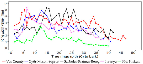 The variability in the annual ring width from pith to bark for each county is shown in Figure 3. The curve shows that Bács-Kiskun County has the narrowest annual rings, while those of Szabolcs-Szatmár-Bereg and Vas Counties show the widest width.