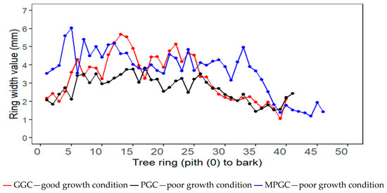 Regarding growing conditions, MPGCs (mixed trees) and GGCs (good growth conditions) showed the greatest annual ring widths, respectively. PGCs (poor growth conditions), on the other hand, displayed the narrowest widths (Figure 4).
