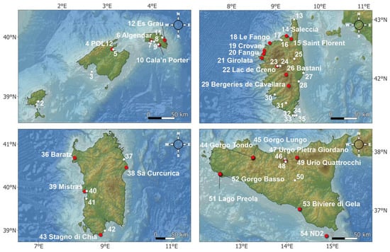 We retrieved 54 pollen records (Figure 1, Table S1) from western Mediterranean islands, based on the literature and online databases [,]. In order to perform an accurate comparative study of the vegetation dynamics, we excluded the following: