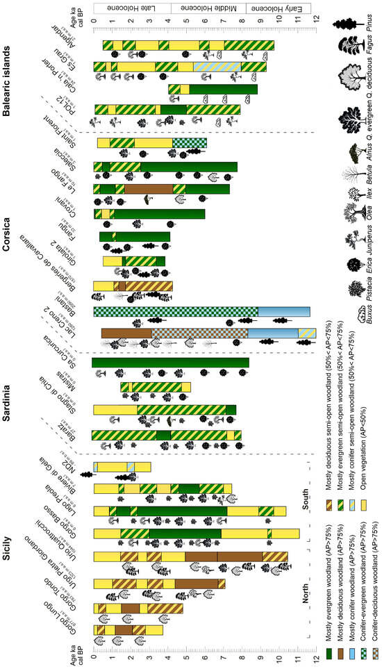 Here we provide an overview of pollen records from Corsica, Sardinia, Sicily, and the Balearic Islands, with the aim of (i) examining and comparing the timing, extent, and rates of changes in vegetation composition, (ii) identifying biogeographic patterns, and (iii) evaluating the influence of Rapid Climate Changes (RCCs) on forest ecosystems. Synthetizing data across multiple sites into a wider regional approach may allow for a better understanding of local and regional vegetation patterns, offering a cohesive narrative of past forest dynamics.