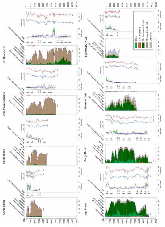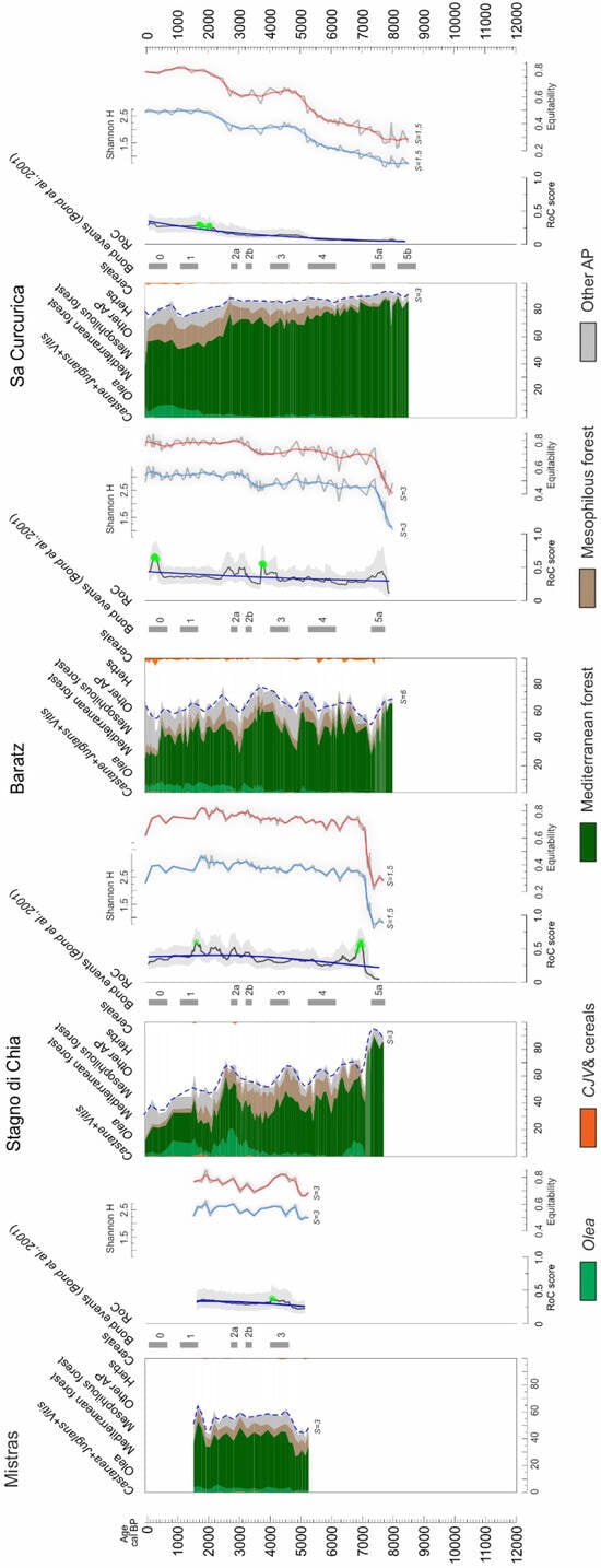 Synthetic pollen diagrams, rate of change (RoC) estimates, and diversity indexes in Sardinia. The pollen diagrams represent cumulative percentages of cultivated trees and cereals (orange), Olea (pale green), Mediterranean forest (dark green), mesophilous forest (pale brown), other AP (grey), and the smoothed AP profile (dashed blue line). RoC sequences include error estimates (grey area), trends (blue line), and peak points (green dots). Shannon pollen diversity (light blue lines) and equitability (red lines) are shown both with their raw values and smoothed curves for each pollen record. The smoothing factor (S) is indicated for each curve. Numbered tiles show the timing of Bond events [].