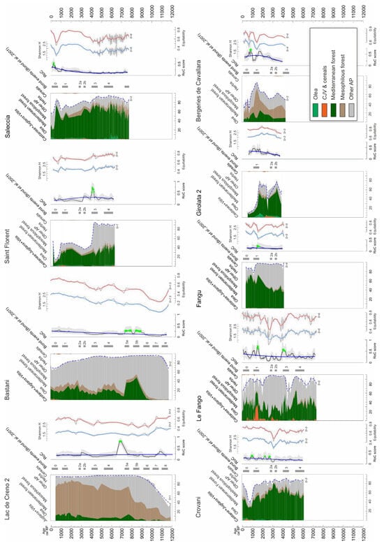 Synthetic pollen diagrams, rate of change (RoC) estimates, and diversity indexes in Corsica. The pollen diagrams represent cumulative percentages of cultivated trees and cereals (orange), Olea (pale green), Mediterranean forest (dark green), mesophilous forest (pale brown), other AP (grey), and the smoothed AP profile (dashed blue line). RoC sequences include error estimates (grey area), trends (blue line), and peak points (green dots). Shannon pollen diversity (light blue lines) and equitability (red lines) are shown both with their raw values and smoothed curves for each pollen record. The smoothing factor (S) is indicated for each curve. Numbered tiles show the timing of Bond events [].