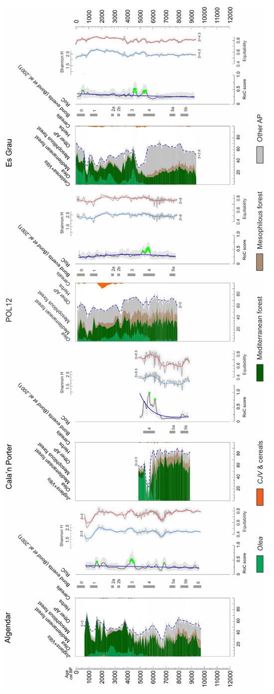 In the interval 4–2 ka cal BP, RoC analysis reveals no significant change. Stable values are observed for pollen diversity and evenness. During this period, a minor oscillation in AP% can be detected at the time of Bond event 2b, especially at POL12 and Es Grau.