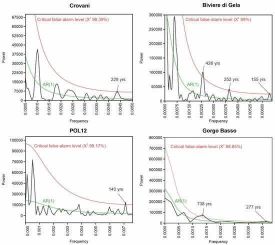 A runs test was carried out on the AP time series of Baratz, Bastani, Biviere di Gela, Calan’ Porter, Crovani, Es Grau, Fangu, Gorgo Basso, Gorgo Tondo, ND2, POL-12, Sa Curcurica, Saint Florent, Stagno di Chia, Urgo Pietra Giordano, and Urio Quattrocchi, whose pollen records meet the selection criteria discussed in Material and Methods. The runs tests indicate that the AR(1) models are appropriate to characterize 11 out of 16 records. Among them, significant periodicities were detected in the following time series: POL12 (runs = 24; 5% acceptance interval = 23–29), Crovani (runs = 16; 5% acceptance interval = 10–16), Biviere di Gela (runs = 24; 5% acceptance interval = 18–33), and Gorgo Basso (runs = 15; 5% acceptance interval = 15–23) (Figure 7).