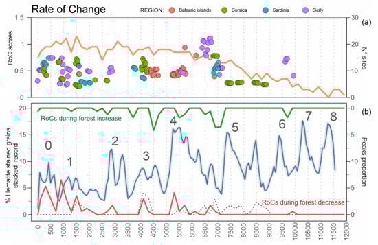Temporal distribution of statistically significant peaks in RoC scores. (a) Dots indicate RoC scores for the Balearic Islands (red), Corsica (green), Sardinia (blue), and Sicily (purple). The orange line shows the number of sites represented in 200-yr time bins. (b) Proportion of significant peaks in RoC scores (200-yr time bins) during forest decreases (red line), increases (green line), and stability (dashed line). The blue line shows the IRD variability through time [].