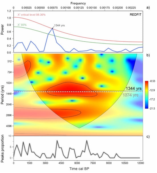 Further insights into the influence of climate events on insular forests composition emerge from the REDFIT analysis, which reveals a significant millennial-scale periodicity of 1344 years (Figure 9), aligning with the cyclicity of ~1374 ± 502 years observed in IRD concentrations for the Holocene []. This result is also supported by Continuous Wavelet Transform analysis, highlighting a consistent periodic signal in the proportion of RoC peaks (Figure 9). The detection of this cyclicity strengthens the hypothesis that long-term climatic rhythms played a key role in shaping ecological resilience and forest composition, providing further context for understanding the climatic forces driving forest cover changes in large western Mediterranean islands.