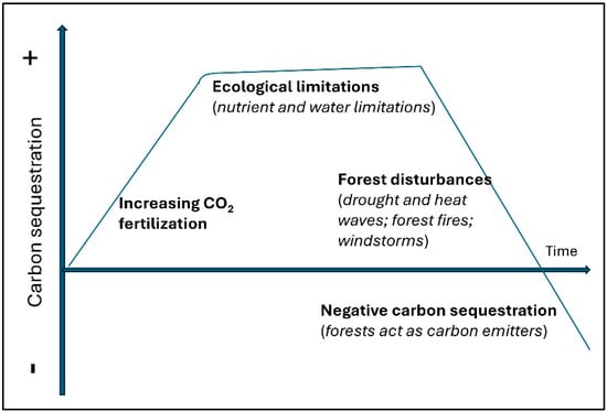 Efficacy and limitations of carbon storage in trees and forests under high atmospheric [CO2]. The graph indicates the responses of forests on harshening environmental conditions in relation to time (x-axis). The first part of the graph shows a linear increase in carbon sequestration with increasing [CO2] fertilization; then, the flat part of the line indicates the effect of the ecological limitation at the site; finally, the sudden drop is caused by forest disturbances that turn the forest from a sink to a source of carbon.