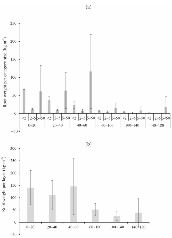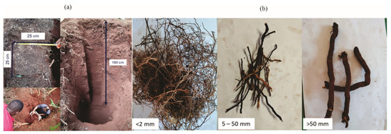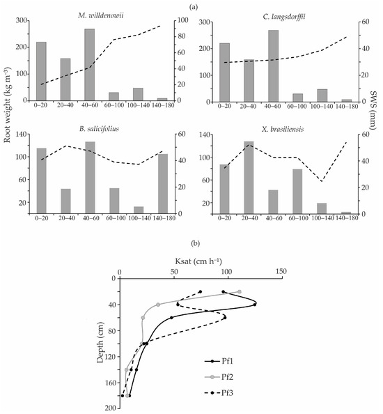 - The species’ roots are mainly concentrated in the surface layers (<60 cm), associated with the availability of nutrients and water, with a non-uniform distribution in the soil profile.