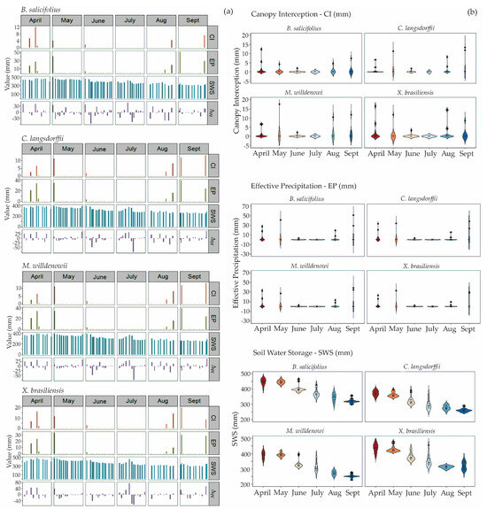 - X. brasiliensis and M. willdenowii showed greater variation in EP and lower values of SWS, with M. willdenowii presenting the highest SWS values.