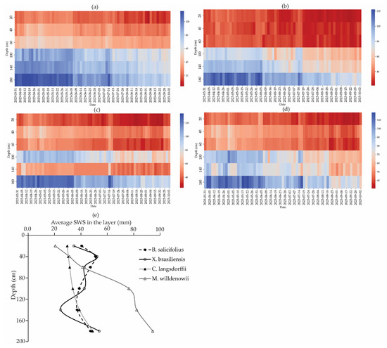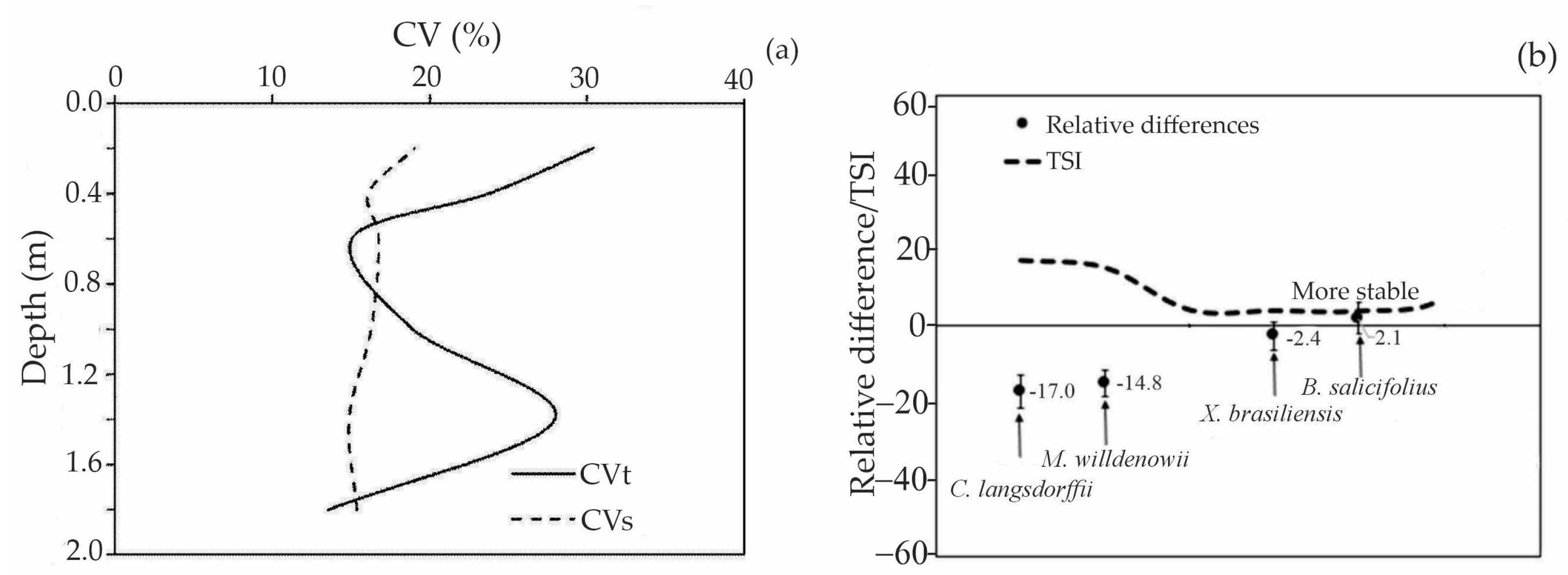 - The root concentration throughout the soil profile contributes to soil moisture variability, especially in the first layers; we observed an inverse relationship between SWS and root concentration in M. willdenowii and C. langsdorffii, indicating that higher root concentration results in lower soil moisture in layers < 100 cm.