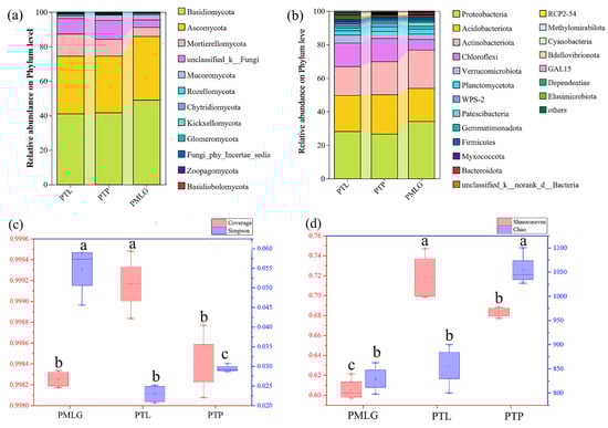 Phylum-level taxonomic structure and α-diversity (OTUs) of soil microbial communities across the three plantation plots. (a) Relative abundance of major taxa at the fungal level. (b) Relative abundance of major taxa at the bacterial level. (c) Simpson and Coverage indices in fungi. (d) Shannoneven and Chao indices in fungi. Notes: PMLG: sanitation cutting treatment group; PTL: Pinus taeda replanting group; PTP: Pinus thunbergii replanting group. Lowercase letters indicate significant differences (p <  0.05) between different plantations.