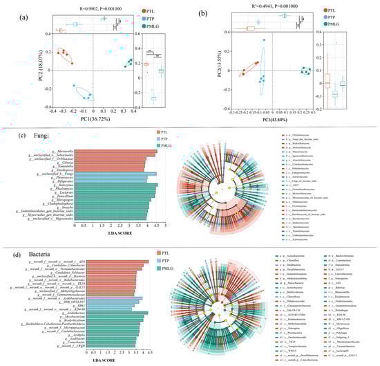 Changes in the soil microbial community structure in three pine plots. (a) PCoA of differences in fungal community structure. (b) PCoA of differences in bacterial community structure. Analysis of LEfSe species differences in fungal (c) and bacterial (d) communities. Note: * indicates a significance level of p < 0.05, ** indicates a significance level of p < 0.01, *** indicates a significance level of p < 0.001. PMLG: sanitation cutting treatment group; PTL: Pinus taeda replanting group; PTP: Pinus thunbergii replanting group.