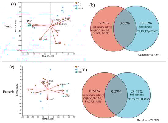 Associations between microbial communities and environmental factors. (a) Redundancy analysis of fungal community structure and its relationship with soil properties. (b) Variance partitioning analysis (VPA) of fungal communities showing the contributions of environmental factors to fungal communities. (c) Redundancy analysis of the bacterial community structure and its relationship with the soil properties. (d) Variance partitioning analysis (VPA) of the bacterial community showing the contributions of environmental factors to the bacterial community. PMLG: mixed pine forests; PTL: Pinus tada forests; PTP: Pinus thunbergii forests.